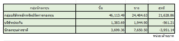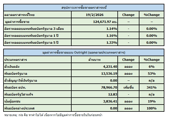 สมาคมตลาดตราสารหนี้ไทย (ThaiBMA) สรุปภาวะตลาดตราสารหนี้ไทยประจำวันนี้ มีมูลค่าการซื้อขายรวมทั้งวันอยู่ที่ 124,672 ล้านบาท ด้านประเภทของนักลงทุน ที่มีมูลค่าการซื้อขายสูงที่สุด 2 อันดับแรก คือ 1. กลุ่มบริษัทหลักทรัพย์จัดการกองทุน (บลจ.) ซื้อสุทธิ 21,629 ล้านบาท 2. กลุ่มบริษัทประกัน ขายสุทธิ 561 ล้านบาท ในขณะที่นักลงทุนต่างชาติ ขายสุทธิ 3,951 ล้านบาท