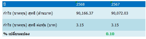 สำหรับผลการดำเนินงานงวดปี 2568 ปตท. และบริษัทย่อย มีกำไรสุทธิรวม 90,166 ล้านบาท เพิ่มขึ้น 94 ล้านบาท หรือร้อยละ 0.1 จากปี 2567 ที่ 90,072 ล้านบาท แม้ว่า EBITDA รวมทั้งปีจะอยู่ที่ 332,849 ล้านบาท ปรับลดลง 63,385 ล้านบาท หรือร้อยละ 16.0 สาเหตุที่กำไรสุทธิยังทรงตัวได้ เป็นผลจากการรับรู้ Non-recurring Items สุทธิเป็นกำไรราว 14,400 ล้านบาท โดยหลักมาจากการจำหน่ายเงินลงทุนใน Lotus และการรับรู้ส่วนแบ่งกำไรของบริษัทร่วมจากการเข้าซื้อกิจการในราคาต่ำกว่ามูลค่ายุติธรรมจากการซื้อและควบรวมโรงกลั่นของกลุ่มเชลล์ในสิงคโปร์ของ TOP สวนทางกับปี 2567 ที่มีขาดทุนพิเศษ 4,400 ล้านบาท (จากด้อยค่า PTTAC สุทธิกับส่วนแบ่งกำไรขายเงินลงทุนใน AMOLH และกำไรจากการจำหน่ายสินทรัพย์ให้ PE LNG ของ PTTLNG)