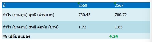 สำหรับกำไรสุทธิส่วนที่เป็นของบริษัทใหญ่ (Net profit) ในไตรมาส 4/2568 อยู่ที่ 197 ล้านบาท เพิ่มขึ้นร้อยละ 1 เมื่อเทียบกับไตรมาส 3/2568 (QoQ) ด้านภาพรวมกำไรสุทธิส่วนที่เป็นของบริษัทใหญ่ประจำปี 2568 ทำได้ 730 ล้านบาท ปรับตัวเพิ่มขึ้นร้อยละ 4 เมื่อเทียบกับช่วงเดียวกันของปีก่อน (YoY) ซึ่งเป็นผลมาจากความสามารถในการทำกำไร การบริหารจัดการต้นทุนการผลิต รวมถึงการได้รับสิทธิประโยชน์ทางภาษี (BOI Privilege)