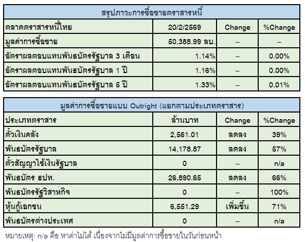 สมาคมตลาดตราสารหนี้ไทย (ThaiBMA) รายงานสรุปภาวะตลาดตราสารหนี้ไทยประจำวันนี้ โดยมีมูลค่าการซื้อขายรวมทั้งสิ้นอยู่ที่ 50,389 ล้านบาท ทั้งนี้ เมื่อจำแนกตามประเภทของนักลงทุนพบว่า กลุ่มที่มีมูลค่าการซื้อขายสูงที่สุด 2 อันดับแรก ได้แก่ กลุ่มบริษัทหลักทรัพย์จัดการกองทุน (บลจ.) ซึ่งมียอดขายสุทธิ 4,885 ล้านบาท ตามด้วยกลุ่มบริษัทจดทะเบียนในประเทศที่มีปริมาณการซื้อสุทธิ 2,098 ล้านบาท ในขณะที่นักลงทุนต่างชาติมียอดซื้อสุทธิ 444 ล้านบาท ด้านอัตราผลตอบแทนพันธบัตรรัฐบาล (Yield) อายุ 5 ปี ปิดตลาดที่ระดับ 1.33% ซึ่งไม่มีการเปลี่ยนแปลงจากวันทำการก่อนหน้า