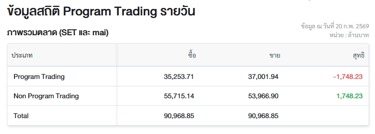 ผู้สื่อข่าวรายงานว่า วันนี้ (20 ก.พ.69) ตลาดหลักทรัพย์แห่งประเทศไทย (ตลท.) เปิดเผยข้อมูลซื้อขายรายวันผ่าน Program Trading หรือ “โปรแกรมโรบอทเทรดดิ้ง” พบว่ามีมูลค่าซื้อจำนวน 35,253.71 ล้านบาท และมูลค่าขายจำนวน 37,001.94 ล้านบาท เท่ากับขายสุทธิ 1,748.23 ล้านบาท