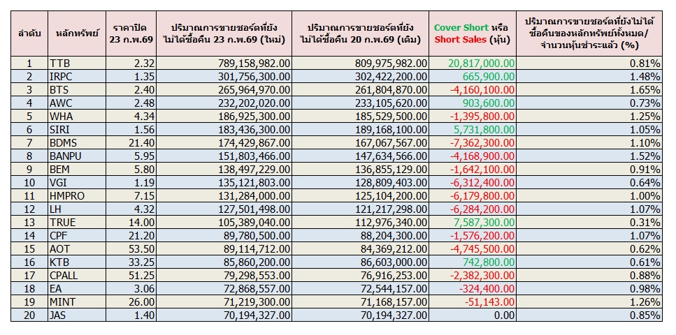 ผู้สื่อข่าวรายงานอ้างอิงการเปิดเผยข้อมูลของ ตลาดหลักทรัพย์แห่งประเทศไทย (ตลท.) เกี่ยวกับหลักทรัพย์ที่ยังคงสถานะการขายชอร์ตที่ยังไม่ได้ซื้อคืน (Outstanding Short Positions) ณ วันที่ 23 ก.พ.69 โดยพบว่ามีหลักทรัพย์ที่ยังคงสถานะการขายชอร์ตที่ยังไม่ได้ซื้อคืน (รวม NDVR) จำนวนทั้งหมด หลักทรัพย์ โดยหุ้นที่คงสถานะขายชอร์ตที่ยังไม่ได้ซื้อคืนสูงสุด 5 อันดับแรกประกอบด้วย