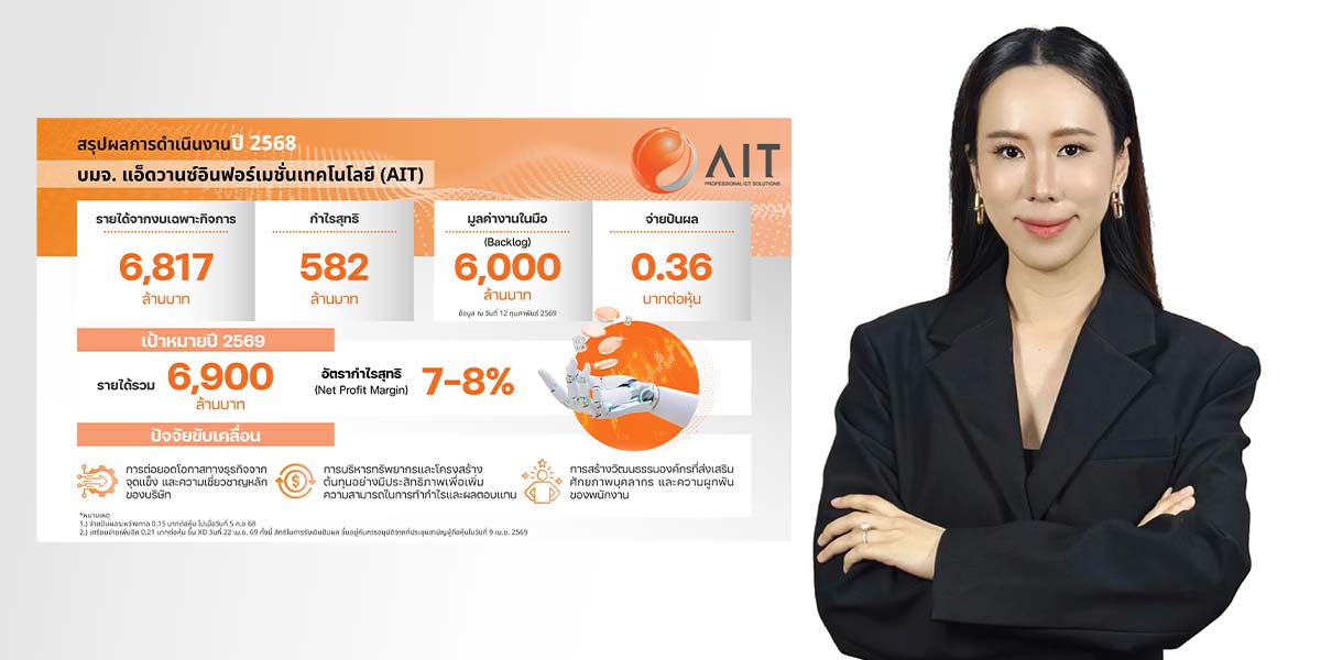 บริษัทฯ ตั้งเป้าหมายรายได้ปี 2569 ไว้ที่ 6,900 ล้านบาท โดยให้ความสำคัญกับการบริหารจัดการต้นทุนอย่างเป็นระบบเพื่อรักษาระดับอัตรากำไรสุทธิ (Net Profit Margin) ให้อยู่ที่ 7-8% ผ่าน 3 กรอบกลยุทธ์หลัก คือ 1.) การต่อยอดโอกาสทางธุรกิจจากจุดแข็งและความเชี่ยวชาญหลักของบริษัท 2.) การบริหารทรัพยากรและโครงสร้างต้นทุนอย่างมีประสิทธิภาพ เพื่อเพิ่มความสามารถในการทำกำไรและผลตอบแทน และ 3.) การสร้างวัฒนธรรมองค์กรที่ส่งเสริมศักยภาพบุคลากรและความผูกพันของพนักงาน ซึ่งจะเป็นรากฐานสำคัญในการขับเคลื่อนการเติบโตอย่างมั่นคงและยั่งยืนในระยะยาว ปัจจุบัน AIT มีมูลค่างานในมือ (Backlog) ณ วันที่ 12 กุมภาพันธ์ 2569 อยู่ที่ประมาณ 6,000 ล้านบาท ทั้งนี้ บริษัทฯ เชื่อมั่นว่าด้วยรากฐานที่มั่นคง จะช่วยให้ AIT ก้าวขึ้นแท่นผู้นำอุตสาหกรรมเทคโนโลยีสารสนเทศและการสื่อสารของประเทศไทยในอนาคต
