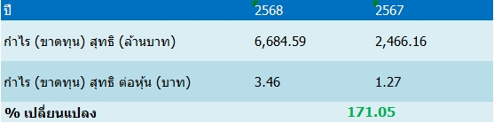 บริษัทรายงานผลการดำเนินงานปี 2568 มีกำไรสุทธิ 6,684.59 ล้านบาท เพิ่มขึ้น 171.05% เมื่อเทียบกับงวดเดียวของปีก่อนมีกำไรสุทธิ 2,466.16 ล้านบาท โดยเป็นผลมาจากรายได้รวมของบริษัทฯ อยู่ที่ 122,950.3 ล้านบาท เพิ่มขึ้น 7.0% จากงวดเดียวของปีก่อนอยู่ที่ 114,942.6 ล้านบาท มีปัจจัยสนับสนุนหลัก ได้แก่