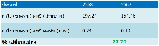 บริษัทรายงานผลการดำเนินงานในปี 2568 มีกำไรสุทธิอยู่ที่ 197.24 ล้านบาท เพิ่มขึ้น 27.70% เมื่อเทียบกับงวดเดียวของปีก่อนมีกำไรสุทธิอยู่ที่ 154.46 ล้านบาท ซึ่งเป็นผลจากบริษัทฯ มีรายงานรายได้เพิ่มขึ้น 34% จากปีก่อน ทำสถิติสูงสุดใหม่ (New High) โดยมีปัจจัยขับเคลื่อนหลักจากการรับรู้รายได้ที่เพิ่มขึ้นในทุกกลุ่มธุรกิจ