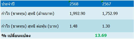 นอกจากนี้ คณะกรรมการมีมติเมื่อวันที่ 24 ก.พ. 2569 ประกาศจ่ายเงินปันงวดดำเนินการ 1 ม.ค. 2568 ถึงวันที่ 31 ธ.ค. 2568 เป็นเงินสดในอัตราหุ้นละ 0.67 บาท โดยวันที่ไม่ได้รับสิทธิปันผล (XD) วันที่ 6 พ.ค. 2569 กำหนดจ่ายปันผลวันที่ 21 พ.ค. 2569