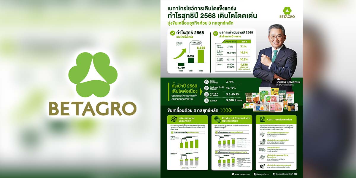 บริษัท เบทาโกร จำกัด (มหาชน) หรือ BTG บริษัทอาหารครบวงจรชั้นนำของไทย รายงานผลการดำเนินงานปี 2568 เติบโตอย่างแข็งแกร่ง สะท้อนการดำเนินงานตามแผนอย่างมีวินัย การปรับพอร์ตสินค้าที่มีประสิทธิภาพ และการมุ่งเน้นการเติบโตที่สร้างผลตอบแทนมากขึ้น