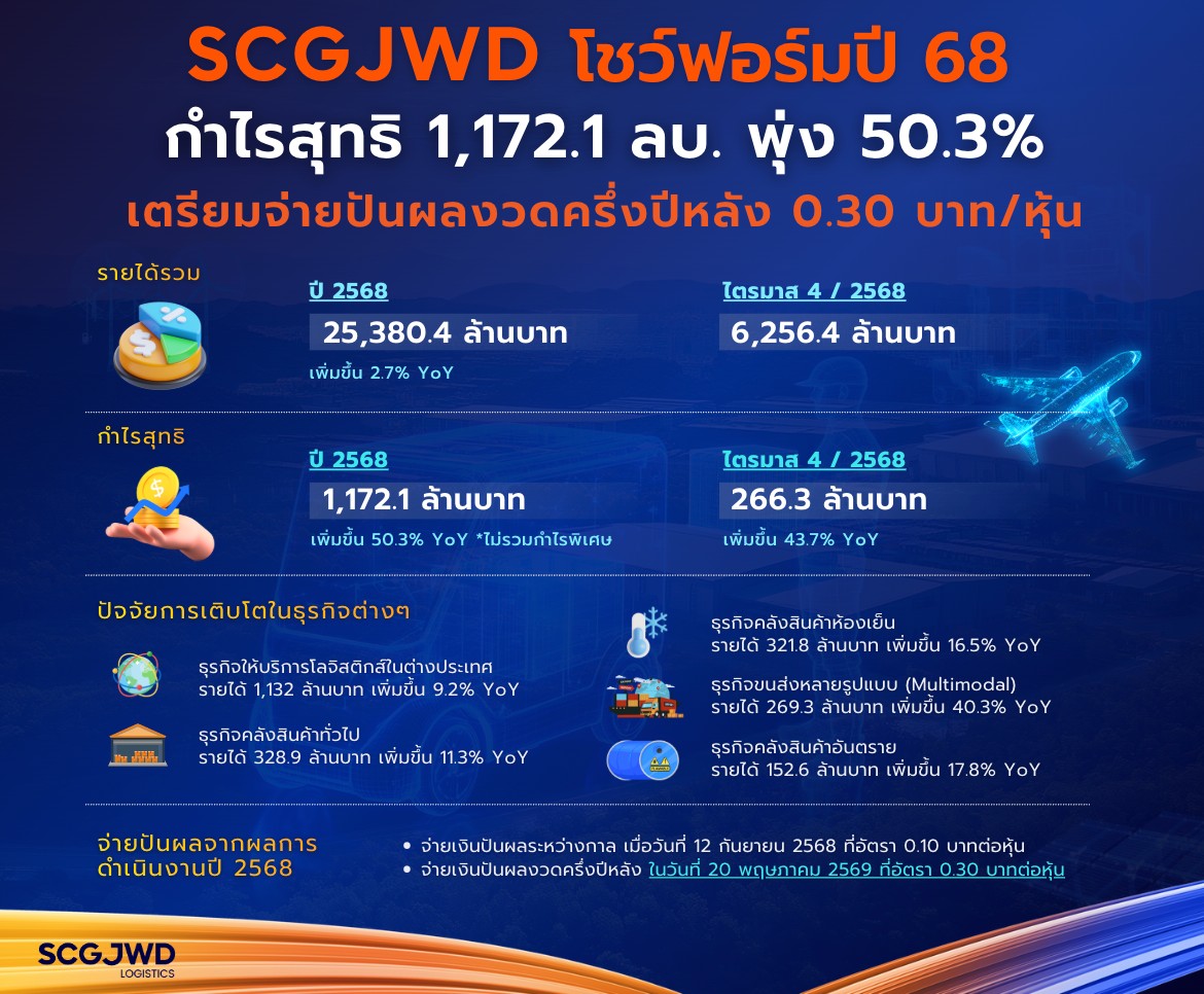 อย่างไรก็ตาม หากนับรวมกำไรพิเศษดังกล่าวบริษัทฯ ยังคงมีกำไรสุทธิปี 2568 เพิ่มขึ้น 4.7% ซึ่งมาจาก SG&A ที่ลดลงกว่า 350 ล้านบาท การควบคุมต้นทุนทางการเงินอย่างมีประสิทธิภาพ รวมถึงส่วนแบ่งกำไรที่เพิ่มขึ้นจากบริษัทในเครือ ขณะที่รายได้รวมอยู่ที่ 25,380.4 ล้านบาท เพิ่มขึ้น 2.7% เมื่อเทียบกับช่วงเดียวกันของปีก่อน สะท้อนถึงความแข็งแกร่งจากความหลากหลายของบริการโลจิสติกส์และซัพพลายแบบครบวงจรและการกระจายการลงทุนในภูมิภาคอาเซียน