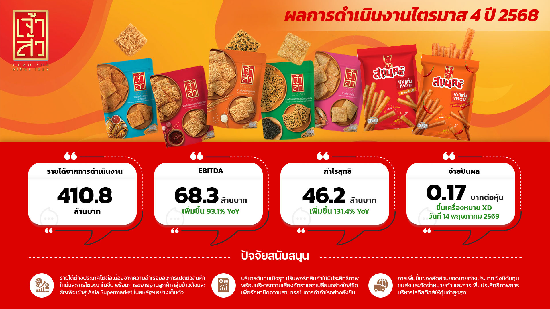 CHAO โชว์ผลงานไตรมาส 4 ปี 2568 แข็งแกร่ง รายได้แตะ 410.8 ล้านบาท กำไรสุทธิ 46.2 ล้านบาท โต 388.2% จากยอดขายต่างประเทศโดยเฉพาะจีนและสหรัฐเติบโตเด่น เดินหน้ารุกตลาด Better-for-you Snack และขยายฐาน B2B ต่อเนื่อง พร้อมประกาศจ่ายปันผล 0.17 บาทต่อหุ้น ขึ้น XD วันที่ 14 พ.ค.นี้