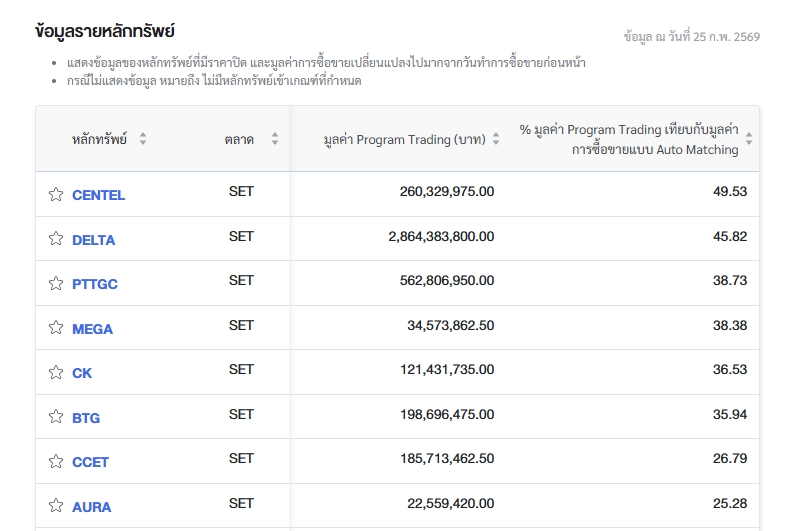 ผู้สื่อข่าวรายงานว่า วันนี้ (25 ก.พ.69) ตลาดหลักทรัพย์แห่งประเทศไทย (ตลท.) เปิดเผยข้อมูลซื้อขายรายวันผ่าน Program Trading หรือ “โปรแกรมโรบอทเทรดดิ้ง” พบว่ามีมูลค่าซื้อจำนวน 41,0446.24 ล้านบาท และมูลค่าขายจำนวน 42,654.91 ล้านบาท เท่ากับขายสุทธิ 1,608.67 ล้านบาท
