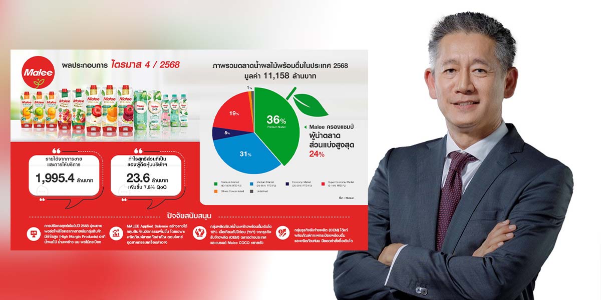 นายเอกรินทร์ พินิจ ประธานเจ้าหน้าที่บริหาร บริษัท มาลี กรุ๊ป จำกัด (มหาชน) หรือ MALEE ผู้ผลิตและจัดจำหน่ายธุรกิจเครื่องดื่มเพื่อสุขภาพ เปิดเผยถึงผลการดำเนินงานในไตรมาส 4/2568 (ตุลาคม-ธันวาคม) ว่า บริษัทฯ มีรายได้จากการขายและการให้บริการ 1,995.4 ล้านบาท ลดลงร้อยละ 1.6 จากไตรมาสก่อน และมีกำไรสุทธิส่วนที่เป็นของผู้ถือหุ้นของบริษัทฯ ตามที่ประกาศ 23.6 ล้านบาท เพิ่มขึ้นร้อยละ 7.8 จากไตรมาสก่อน
