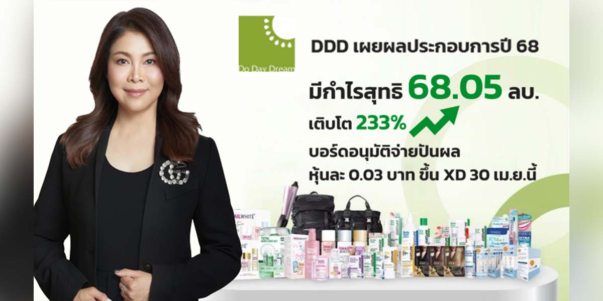 DDD อวดงบปี 68 กำไรสุทธิ 68 ลบ. โตกระฉูด 233% อานิสงส์คุมต้นทุนเยี่ยม ดันยอดขายในประเทศ-LESASHA โตเด่น บอร์ดไฟเขียวปันผล 0.03 บ. ขึ้น XD 30 เม.ย. 69 พร้อมกางแผนปี 69 ลุยผนึกพันธมิตรปั๊มยอดขาย
