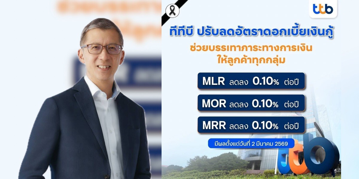 TTB เด้งรับ กนง. หั่นดอกเบี้ยเงินกู้ MOR, MLR, MRR ลง 0.10% ดีเดย์ 2 มี.ค. 69 หวังลดต้นทุนธุรกิจ-ครัวเรือน พร้อมชูมาตรฐานใหม่สินเชื่อบุคคลคิดดอกเบี้ยตามความเสี่ยง เริ่มต้น 13.99%