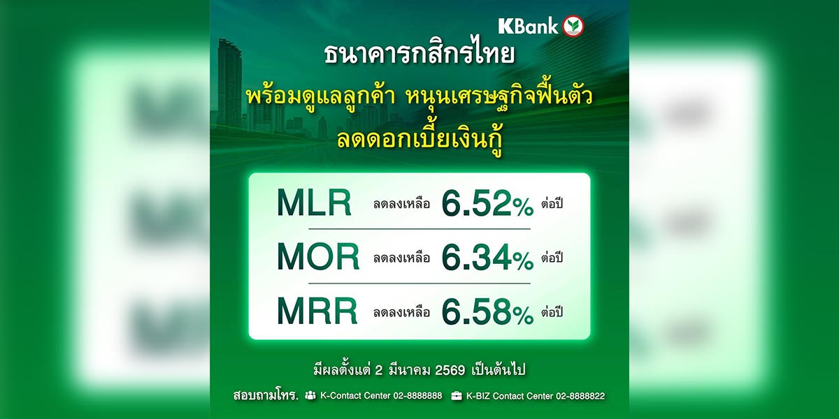 KBANK ประกาศปรับลดอัตราดอกเบี้ยเงินกู้ตามทิศทางดอกเบี้ยนโยบาย โดย MLR ลดเหลือ 6.52% MOR เหลือ 6.34% และ MRR เหลือ 6.58% มีผลตั้งแต่ 2 มี.ค.69 เป็นต้นไป หวังช่วยลดภาระต้นทุนทางการเงิน เสริมสภาพคล่องลูกค้าทุกกลุ่ม