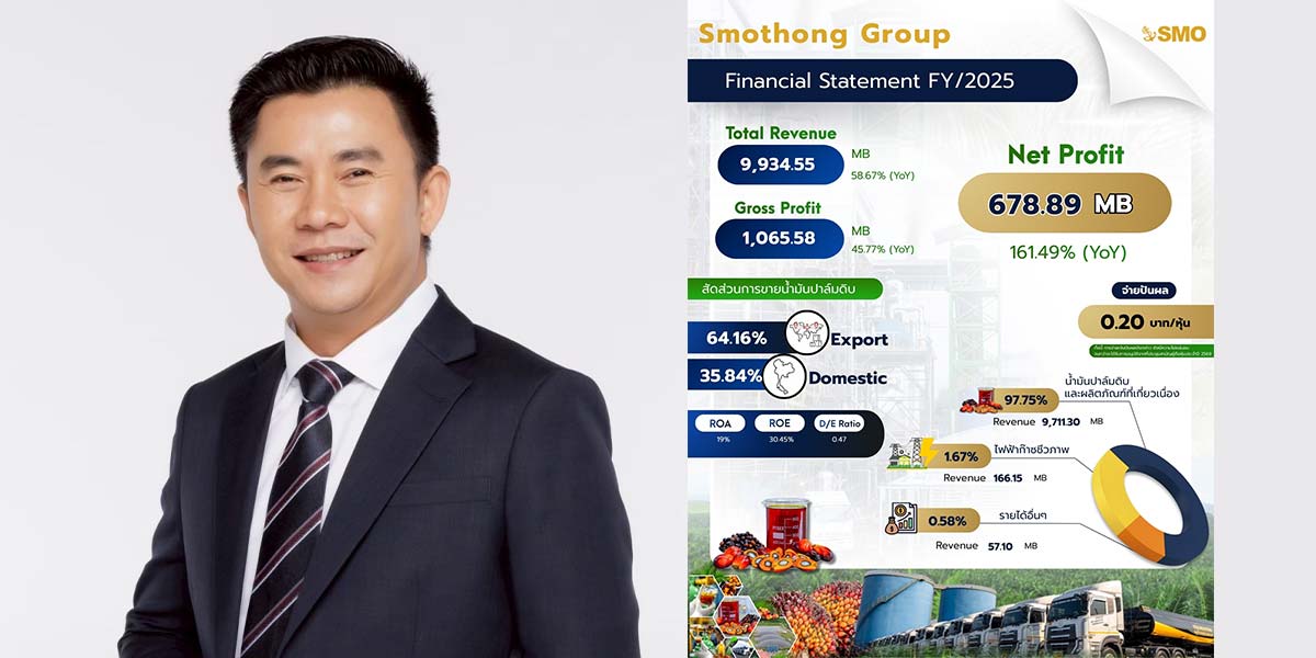 นายกิตติพงษ์ พวงมาลา ประธานเจ้าหน้าที่บริหาร บริษัท กลุ่มสมอทอง จำกัด (มหาชน) หรือ SMO ผู้ประกอบธุรกิจผลิตและจำหน่ายน้ำมันปาล์มดิบและผลิตภัณฑ์ที่เกี่ยวเนื่อง รวมถึงธุรกิจผลิตไฟฟ้าจากเชื้อเพลิงก๊าซชีวภาพเพื่อจำหน่ายให้กับการไฟฟ้าส่วนภูมิภาค เปิดเผยถึงผลประกอบการของบริษัทประจำปี 2568 ว่า บริษัทฯ มีกำไรสุทธิอยู่ที่ 678.89 ล้านบาท ปรับตัวเพิ่มสูงขึ้น 419.27 ล้านบาท หรือคิดเป็นอัตราการเติบโตร้อยละ 161.49 และมีรายได้รวม 9,934.55 ล้านบาท ปรับตัวเพิ่มสูงขึ้น 3,673.45 ล้านบาท หรือคิดเป็นการเพิ่มขึ้นร้อยละ 58.67