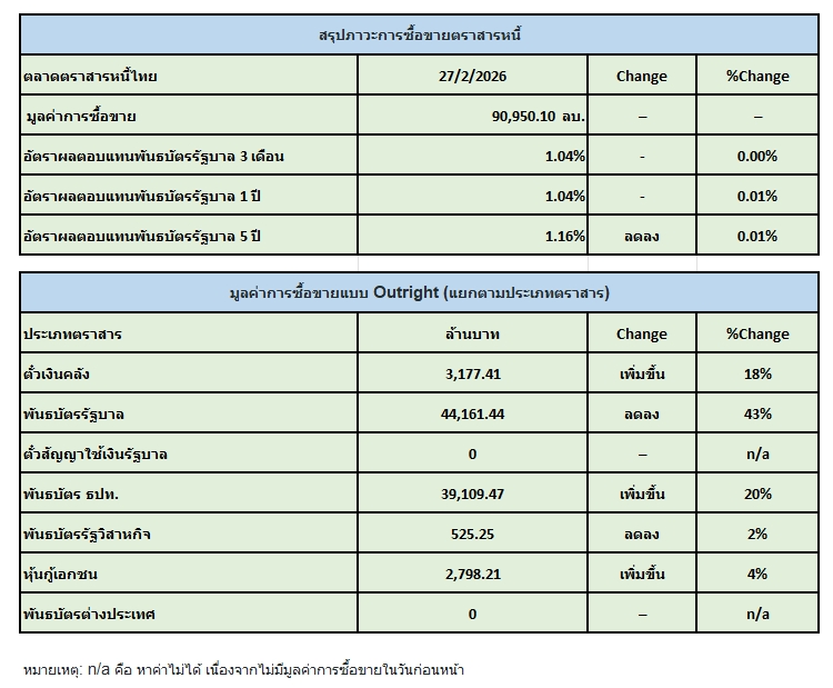 สมาคมตลาดตราสารหนี้ไทย(ThaiBMA) สรุปภาวะตลาดตราสารหนี้ไทยประจำวันนี้ มีมูลค่าการซื้อขายรวมทั้งวันอยู่ที่ 90,950 ล้านบาท ด้านประเภทของนักลงทุน ที่มีมูลค่าการซื้อขายสูงที่สุด 2 อันดับแรก คือ 1. กลุ่มบริษัทหลักทรัพย์จัดการกองทุน (บลจ.) ขายสุทธิ 11,998 ล้านบาท 2. กลุ่มบริษัทประกัน ขายสุทธิ 1,072 ล้านบาท ในขณะที่นักลงทุนต่างชาติ ซื้อสุทธิ 6,988 ล้านบาท Yield พันธบัตรอายุ 5 ปี ปิดที่ 1.16% ปรับตัวลดลงจากเมื่อวาน -0.01%