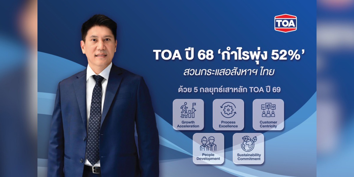 บริษัท ทีโอเอ เพ้นท์ (ประเทศไทย) จำกัด (มหาชน) หรือ TOA ผู้นำนวัตกรรมของอุตสาหกรรมสีอันดับ 1 เคมีภัณฑ์ก่อสร้าง และวัสดุตกแต่งพื้นผิวครบวงจรของไทย ประกาศผลประกอบการปี 2568 เติบโตอย่างโดดเด่นสวนกระแสสภาวะตลาดอสังหาริมทรัพย์ไทยที่ชะลอตัว โชว์รายได้รวม 21,779 ล้านบาท เติบโตขึ้น 2% พร้อมกำไรสุทธิ 2,917 ล้านบาท พุ่งแรงถึง 52% เตรียมเสนอจ่ายเงินปันผลครึ่งปีหลัง 0.39 บาท เดินหน้ายุทธศาสตร์ 5 เสาหลัก มุ่งสู่การเติบโตอย่างยั่งยืนและเป้าหมาย NET ZERO