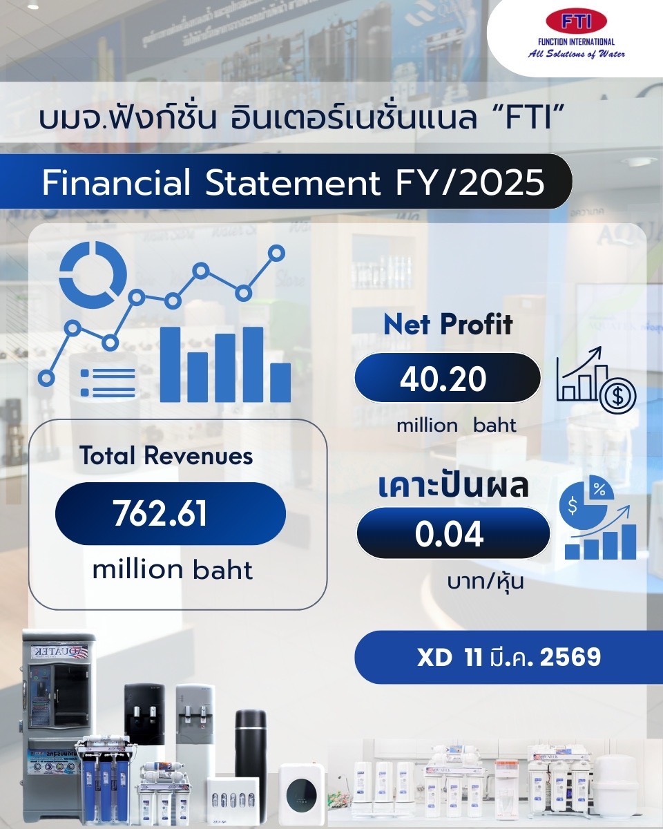 ดร.วิกร ภูวพัชร์ ประธานเจ้าหน้าที่บริหาร บริษัท ฟังก์ชั่น อินเตอร์เนชั่นแนล จำกัด (มหาชน) หรือ FTI เปิดเผยว่า สำหรับผลการดำเนินงานของปี 2568 บริษัทมีกำไรสุทธิ 40.20 ล้านบาท ปรับตัวเพิ่มขึ้น 3.63 ล้านบาท หรือคิดเป็นเพิ่มขึ้น 9.93% เมื่อเทียบกับปี 2567 ที่มีกำไรสุทธิ 36.57 ล้านบาท และมีรายได้รวมจากการขายสินค้า และบริการอยู่ที่ 762.61 ล้านบาท ปรับตัวลดลลงเล็กน้อยที่ 42.43 ล้านบาท หรือคิดเป็นลดลง 5.27% เมื่อเทียบกับช่วงเดียวกันปีก่อนที่มีรายได้รวม 805.04 ล้านบาท