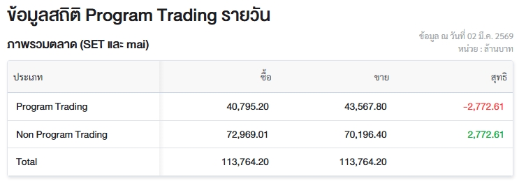 ผู้สื่อข่าวรายงานว่า วันนี้ (2 มี.ค.69) ตลาดหลักทรัพย์แห่งประเทศไทย (ตลท.) เปิดเผยข้อมูลซื้อขายรายวันผ่าน Program Trading หรือ “โปรแกรมโรบอทเทรดดิ้ง” พบว่ามีมูลค่าซื้อจำนวน 40,795.20 ล้านบาท และมูลค่าขายจำนวน 43,567.80 ล้านบาท เท่ากับขายสุทธิ 2,772.61 ล้านบาท