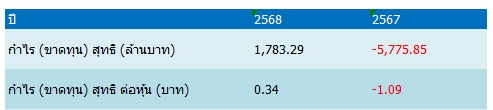 โดยบริษัทฯ มีการแบ่งปันกำไรสำหรับปีส่วนที่เป็นของผู้ถือหุ้นของบริษัท จำนวน 1,783 ล้านบาท ซึ่งเป็นการพลิกมีกำไรและปรับตัวเพิ่มขึ้นจากช่วงเวลาเดียวกันของปีก่อนถึง 7,559 ล้านบาท โดยมีปัจจัยสนับสนุนหลักจากการบันทึกกำไรพิเศษและการปรับโครงสร้างเงินลงทุน แม้จะเผชิญกับผลขาดทุนในส่วนของธุรกิจหลักก็ตาม