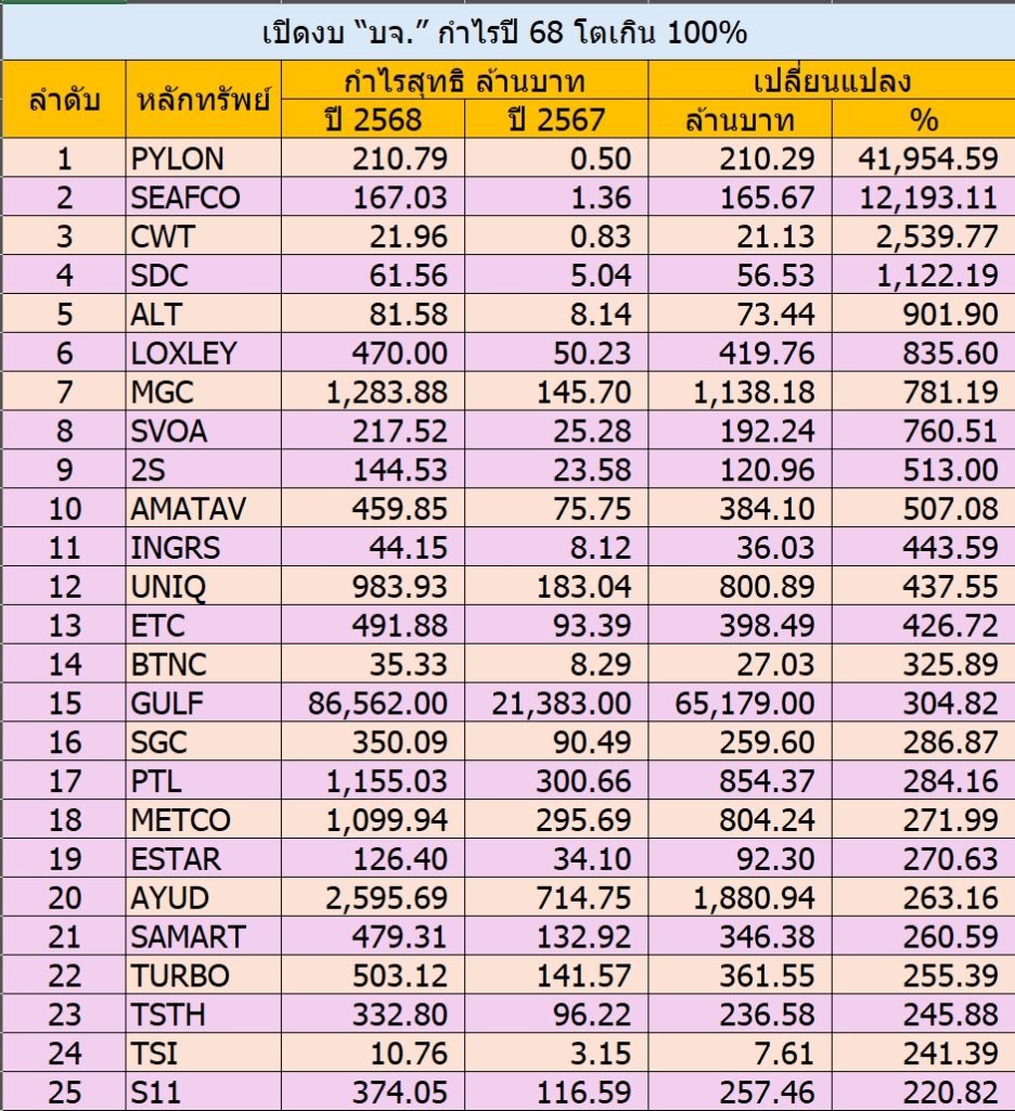 เปิดโผ 45 บจ.กำไรปี 68 โตเกิน 100% ชู PYLON-SEAFCO–GULF-MGC นำทัพ