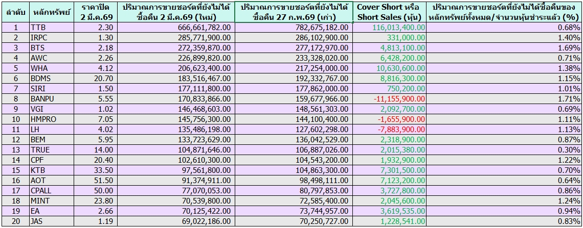 เปิด 20 อันดับหุ้นถูก “Cover-Short” สูงสุด ณ 2 มี.ค.69