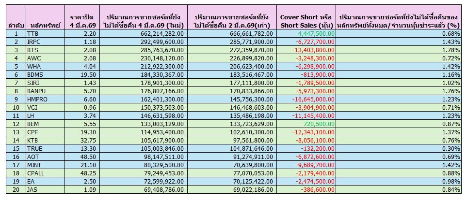 เปิด 20 อันดับหุ้นถูก “Cover-Short” สูงสุด ณ 4 มี.ค.69