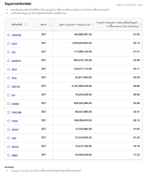 นอกจากนี้ ตลาดหลักทรัพย์แห่งประเทศไทย (ตลท.) รายงานข้อมูลหลักทรัพย์ที่มีการซื้อขายผ่านระบบ Program Trading สูงสุด โดยพิจารณาจากสัดส่วนมูลค่า Program Trading เทียบกับมูลค่าการซื้อขายแบบ Auto Matching พบว่ามี หลักทรัพย์ที่มีการทำรายการสูงสุดในวันนี้ ได้แก่