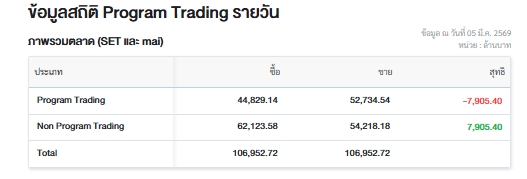 ผู้สื่อข่าวรายงานว่า วันนี้ (5 มี.ค.69) ตลาดหลักทรัพย์แห่งประเทศไทย (ตลท.) เปิดเผยข้อมูลซื้อขายรายวันผ่าน Program Trading หรือ “โปรแกรมโรบอทเทรดดิ้ง” พบว่ามีมูลค่าซื้อจำนวน 44,829.14 ล้านบาท และมูลค่าขายจำนวน 52,734.54 ล้านบาท เท่ากับขายสุทธิ 7,905.40 ล้านบาท