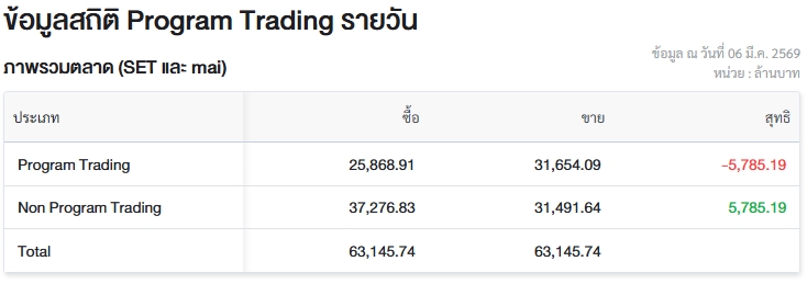 ผู้สื่อข่าวรายงานว่า วันนี้ (6 มี.ค.69) ตลาดหลักทรัพย์แห่งประเทศไทย (ตลท.) เปิดเผยข้อมูลซื้อขายรายวันผ่าน Program Trading หรือ “โปรแกรมโรบอทเทรดดิ้ง” พบว่ามีมูลค่าซื้อจำนวน 25,868.91 ล้านบาท และมูลค่าขายจำนวน 31,654.09 ล้านบาท เท่ากับขายสุทธิ 5,785.19 ล้านบาท