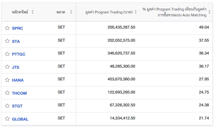 นอกจากนี้ ตลาดหลักทรัพย์แห่งประเทศไทย (ตลท.) รายงานข้อมูลหลักทรัพย์ที่มีการซื้อขายผ่านระบบ Program Trading สูงสุด โดยพิจารณาจากสัดส่วนมูลค่า Program Trading เทียบกับมูลค่าการซื้อขายแบบ Auto Matching พบว่ามี 8 หลักทรัพย์ที่มีการทำรายการสูงสุดในวันนี้ ได้แก่
