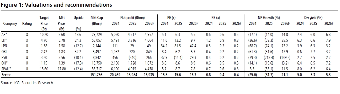 อย่างไรก็ตาม ทางฝ่ายวิจัยคาดว่ากำไรรวมของกลุ่มในปี 2569 จะฟื้นตัวเด่น โดยยังคงประมาณการกำไรรวมปี 2569 ไว้ที่ราว 1.7 หมื่นล้านบาท เพิ่มขึ้น 21% เมื่อเทียบกับงวดเดียวกันของปีก่อนจากฐานที่ต่ำในปีก่อน ปัจจัยสนับสนุนหลักมาจาก 1) การเพิ่มขึ้นของยอดโอนคอนโดมิเนียมใหม่จาก AP , LH, SPALI และ ORI 2) กำไรจากการขายสินทรัพย์ของ LH และ ORI ที่เพิ่มขึ้น และ 3) การตั้งสำรองและการตัดจำหน่ายที่คาดว่าจะลดลง