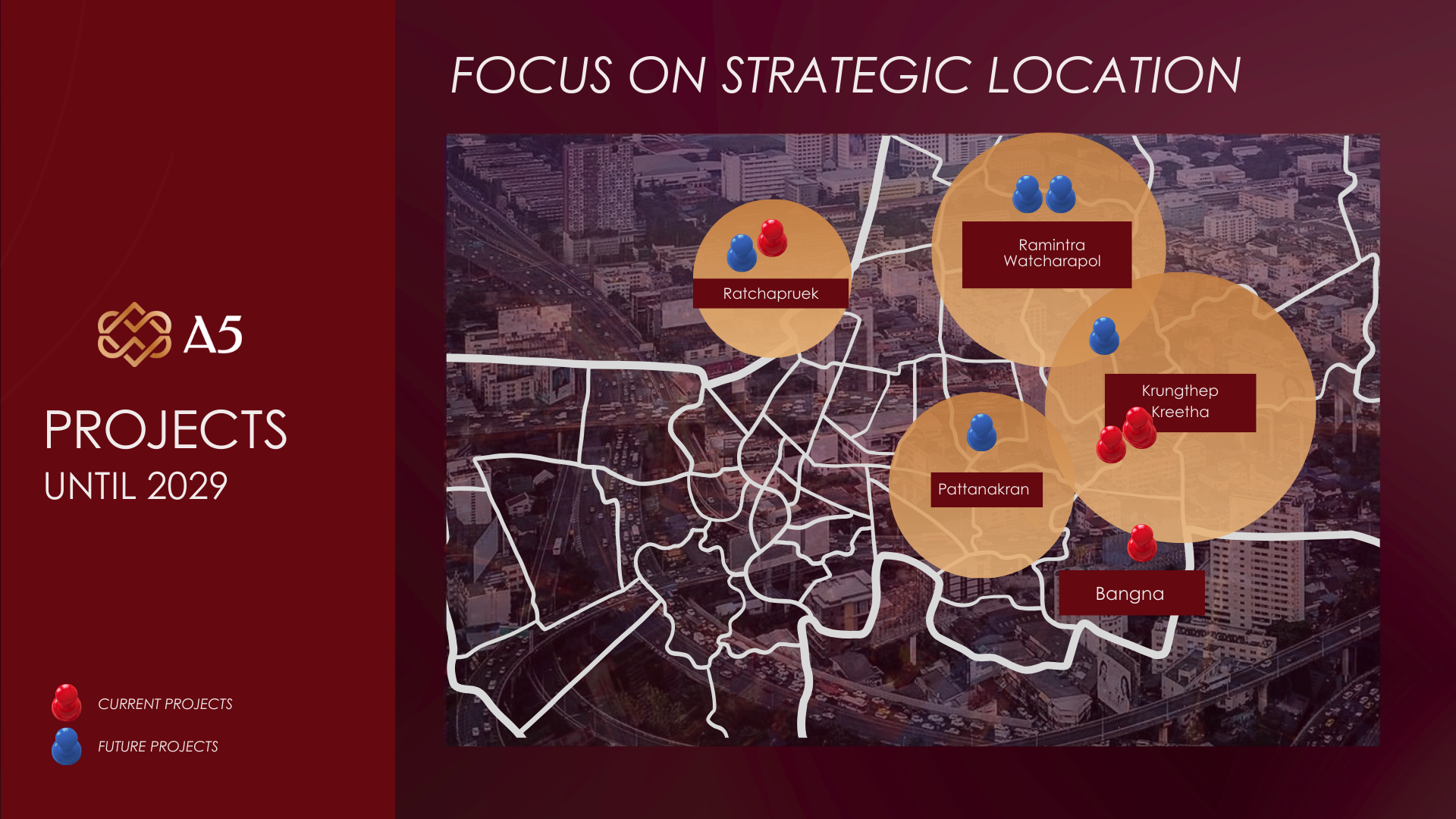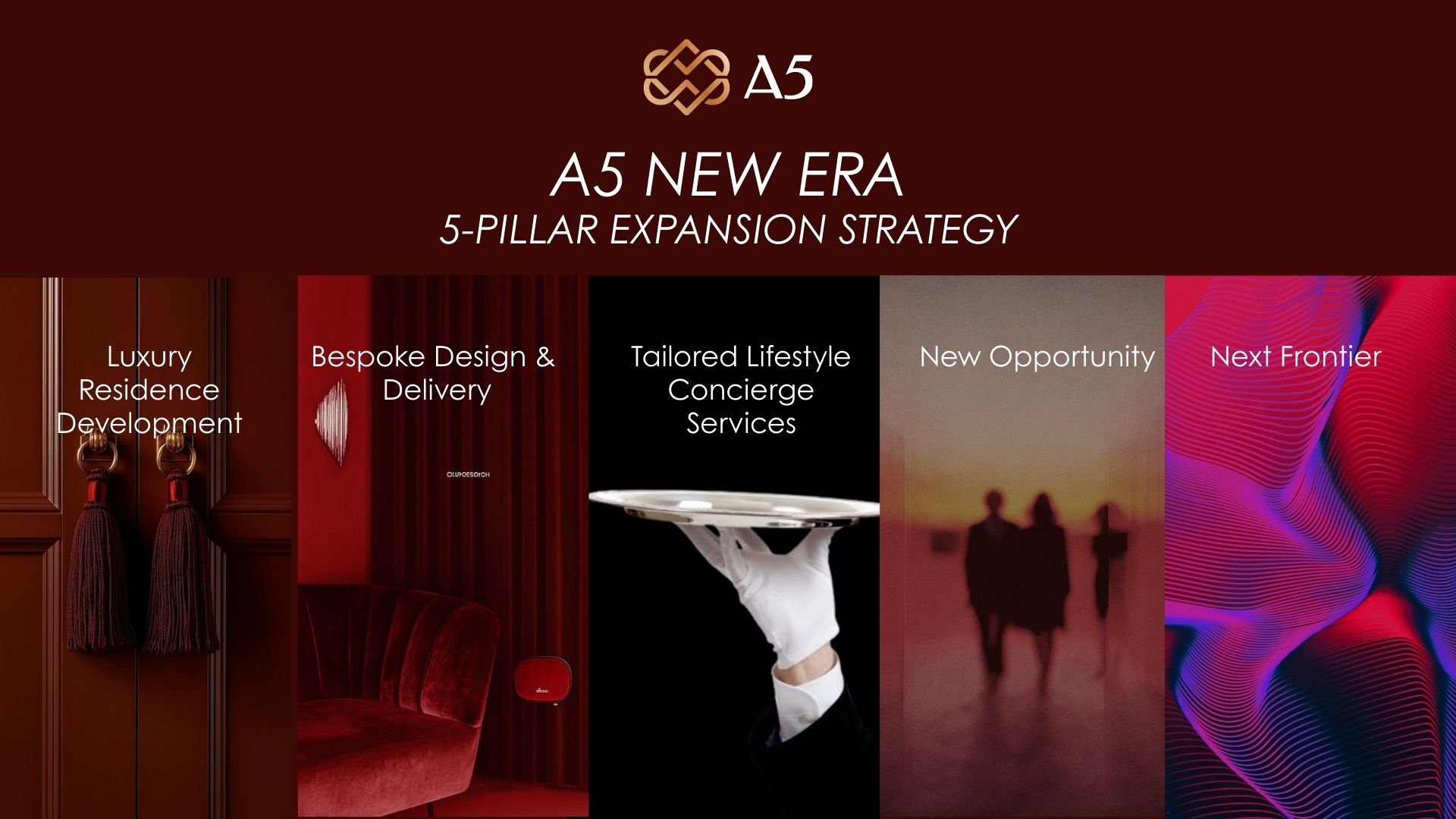 ด้วยเหตุนี้ A5 จึงได้กำหนดกลยุทธ์ “5 เสาหลัก” เพื่อขับเคลื่อนองค์กรสู่ความยั่งยืนในระดับ 100 ปี ประกอบด้วย 1.การพัฒนาที่อยู่อาศัย (Residential) ซึ่งเป็นเสาหลักเดิม 2.บริษัท เอไฟว์ ดีไซน์ จำกัด (A5 Design) 3.บริษัท อัพเพอร์ คลาส โซลูชัน จำกัด (Upper Class Solution) 4.New Opportunity การแบ่งงบลงทุนจากการซื้อที่ดิน 2-3 แปลงต่อปี มาลงทุน 1 แปลงในธุรกิจใหม่ๆ เพื่อสร้างรายได้เพิ่ม และ 5.บริษัทด้านเทคโนโลยี (Tech Company) ซึ่งจะมีการเปิดตัวในระยะถัดไป