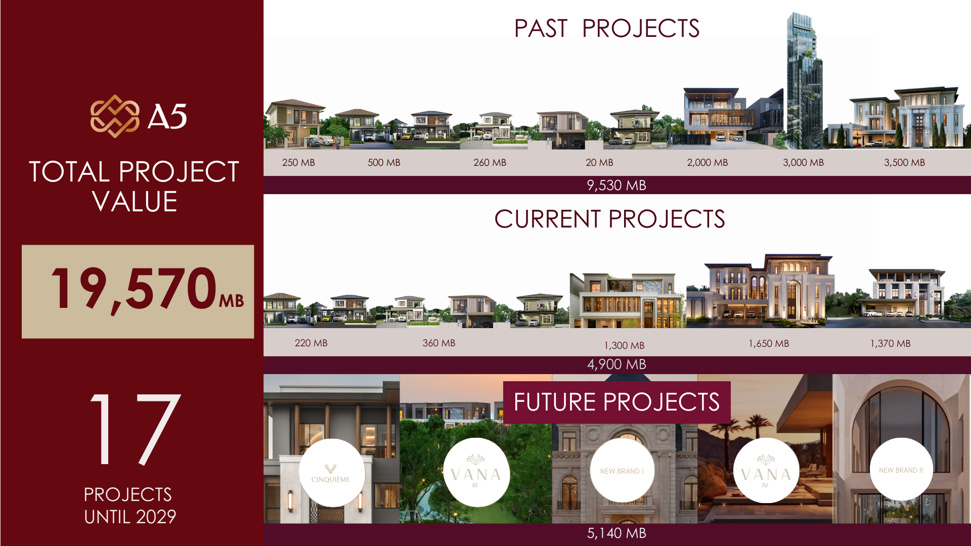 สำหรับการเปิดตัว 2 บริษัทใหม่ในครั้งนี้ จะช่วยเสริมสร้าง Ecosystem ของ A5 ให้สมบูรณ์ยิ่งขึ้น โดยสามารถลดต้นทุนการดำเนินงานภายในโครงการของบริษัทฯ เองได้หลายสิบล้านบาทต่อปี สามารถควบคุมคุณภาพงานบริการ และยังสามารถต่อยอดรับงานจากลูกค้าภายนอกได้อีกด้วย ซึ่งบริษัทฯ ตั้งเป้าหมายว่าภายใน 2-3 ปี ธุรกิจใหม่เหล่านี้จะสร้างสัดส่วนรายได้ประจำให้บริษัทฯ ได้ถึง 20% ของรายได้รวม และมีแผนที่จะนำทั้ง 2 บริษัทนี้เข้าจดทะเบียนในตลาดหลักทรัพย์ฯ ภายใน 3 ปีข้างหน้าหากผลประกอบการเป็นไปตามเกณฑ์
