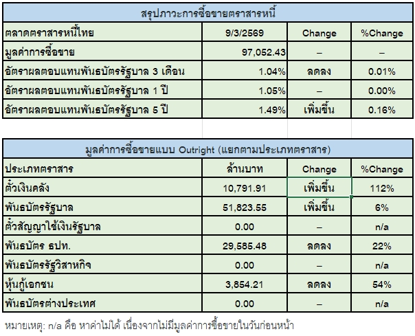 สมาคมตลาดตราสารหนี้ไทย (ThaiBMA) สรุปภาวะตลาดตราสารหนี้ไทยประจำวันนี้มีมูลค่าการซื้อขายรวมทั้งวันอยู่ที่ 97,052 ล้านบาท ด้านประเภทของนักลงทุน ที่มีมูลค่าการซื้อขายสูงที่สุด 2 อันดับแรก คือ 1.) กลุ่มบริษัทหลักทรัพย์จัดการกองทุน (บลจ.) ซื้อสุทธิ 17,573 ล้านบาท, 2.)กลุ่มบริษัทประกัน ซื้อสุทธิ 1,581 ล้านบาท ในขณะที่นักลงทุนต่างชาติ ขายสุทธิ 2,543 ล้านบาท ส่วน Yield พันธบัตรอายุ 5 ปี ปิดที่ 1.49% ปรับตัวเพิ่มขึ้นจากเมื่อวาน +0.16%