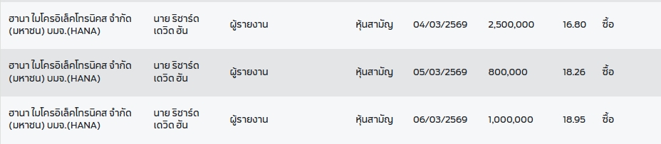 สำนักงานคณะกรรมการกำกับหลักทรัพย์และตลาดหลักทรัพย์ (ก.ล.ต.) เปิดเผยว่า ได้รับรายงานแบบแสดงการเปลี่ยนแปลงการถือหลักทรัพย์ของผู้บริหาร (แบบ 59) ของบริษัท ฮานา ไมโครอิเล็คโทรนิคส จำกัด (มหาชน) หรือ HANA โดยระบุว่า นาย ริชาร์ด เดวิด ฮัน ได้ทำรายการซื้อหุ้นของบริษัท 3 รายการ เมื่อวันที่ 4-6 มีนาคม 2569 จำนวน 4,300,000 หุ้น
