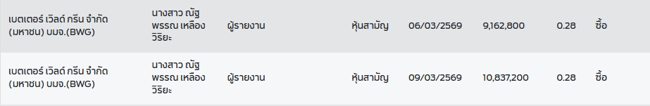 สำนักงานคณะกรรมการกำกับหลักทรัพย์และตลาดหลักทรัพย์ (ก.ล.ต.) เปิดเผยว่า ได้รับรายงานแบบแสดงการเปลี่ยนแปลงการถือหลักทรัพย์ของผู้บริหาร (แบบ 59) ของบริษัท เบตเตอร์ เวิลด์ กรีน จำกัด (มหาชน) หรือ BWG โดยระบุว่า นางสาวณัฐพรรณ เหลืองวิริยะ กรรมการ ได้ทำรายการซื้อหุ้นของบริษัท 2 รายการ เมื่อวันที่ 6 และ 9 มีนาคม 2569 จำนวน 20 ล้านหุ้น
