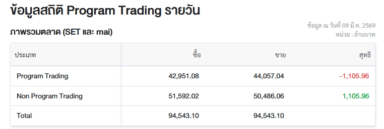 ผู้สื่อข่าวรายงานว่า วันนี้ (9 มี.ค.69) ตลาดหลักทรัพย์แห่งประเทศไทย (ตลท.) เปิดเผยข้อมูลซื้อขายรายวันผ่าน Program Trading หรือ “โปรแกรมโรบอทเทรดดิ้ง” พบว่ามีมูลค่าซื้อจำนวน 44,829.14 ล้านบาท และมูลค่าขายจำนวน 42,951.08 ล้านบาท เท่ากับขายสุทธิ 1,105.96 ล้านบาท