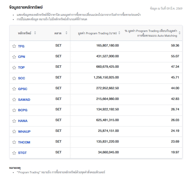 นอกจากนี้ ตลาดหลักทรัพย์แห่งประเทศไทย (ตลท.) รายงานข้อมูลหลักทรัพย์ที่มีการซื้อขายผ่านระบบ Program Trading สูงสุด โดยพิจารณาจากสัดส่วนมูลค่า Program Trading เทียบกับมูลค่าการซื้อขายแบบ Auto Matching พบว่ามี หลักทรัพย์ที่มีการทำรายการสูงสุดในวันนี้ ได้แก่