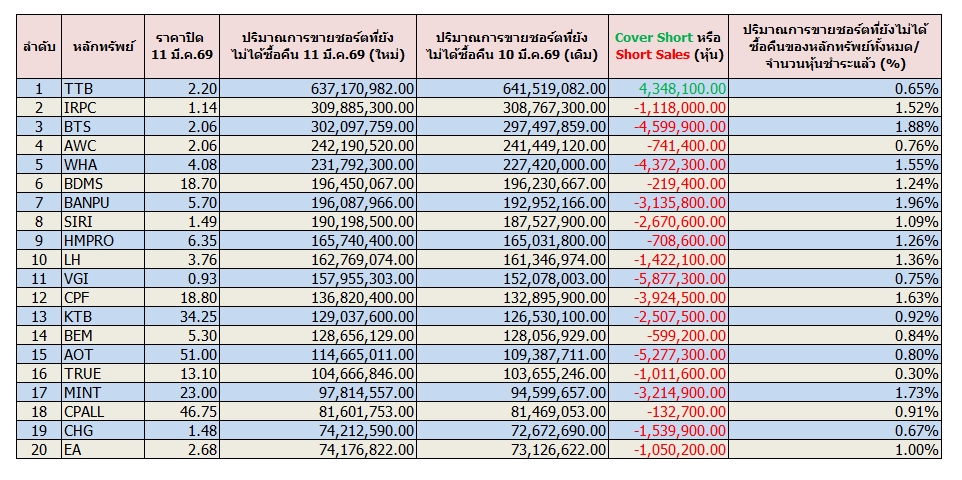 ข้อมูลสิ้นสุด 11 มี.ค.69 พบ TTB มีปริมาณชอร์ตคงค้างเหลือมากสุด 637 ล้านหุ้น คิดเป็น 0.65% ถูก Cover Short สูงสุด 4 ล้านหุ้น ขณะที่ VGI ถูก Short Sales สูงสุด 5.8 ล้านหุ้น