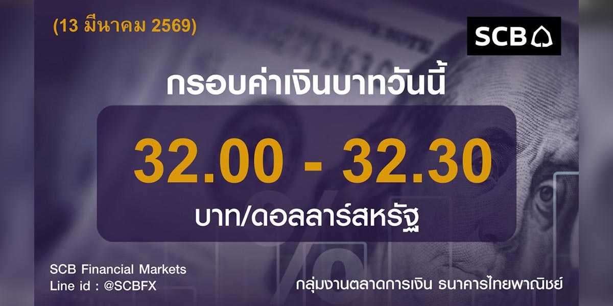 กลุ่มงานตลาดการเงิน ธนาคารไทยพาณิชย์ (SCB Financial Markets) ประเมินค่าเงินบาทประจำวันที่ 13 มีนาคม 2569 โดยคาดการณ์ว่าค่าเงินบาทจะเคลื่อนไหวอยู่ในกรอบ 32.00-32.30 บาทต่อดอลลาร์สหรัฐ ซึ่งทิศทางเงินบาทยังคงอยู่ในภาวะอ่อนค่า โดยมีปัจจัยกดดันหลักมาจากราคาน้ำมันดิบในตลาดโลกที่ปรับตัวสูงขึ้นอย่างต่อเนื่อง และการแข็งค่าของดัชนีเงินดอลลาร์สหรัฐ นอกจากนี้ อัตราผลตอบแทนพันธบัตรรัฐบาลสหรัฐ (US Treasury yields) ยังคงปรับตัวสูงขึ้นตามแนวโน้มของภาวะเงินเฟ้อ ขณะที่มุมมองของตลาดเริ่มประเมินว่าธนาคารกลางสหรัฐ (เฟด) อาจจะไม่มีการปรับลดอัตราดอกเบี้ยลงภายในปีนี้แล้ว