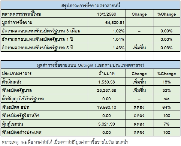 สมาคมตลาดตราสารหนี้ไทย (ThaiBMA) สรุปภาวะตลาดตราสารหนี้ไทยประจำวันนี้มีมูลค่าการซื้อขายรวมทั้งวันอยู่ที่ 64,501 ล้านบาท ด้านประเภทของนักลงทุน ที่มีมูลค่าการซื้อขายสูงที่สุด 2 อันดับแรก คือ 1. กลุ่มบริษัทหลักทรัพย์จัดการกองทุน (บลจ.) ซื้อสุทธิ 5,547 ล้านบาท 2. กลุ่มบริษัทประกัน ซื้อสุทธิ 544 ล้านบาท ในขณะที่นักลงทุนต่างชาติ ขายสุทธิ 6,627 ล้านบาท ส่วน Yield พันธบัตรอายุ 5 ปี ปิดที่ 1.46% ปรับตัวเพิ่มขึ้นจากเมื่อวาน +0.03%