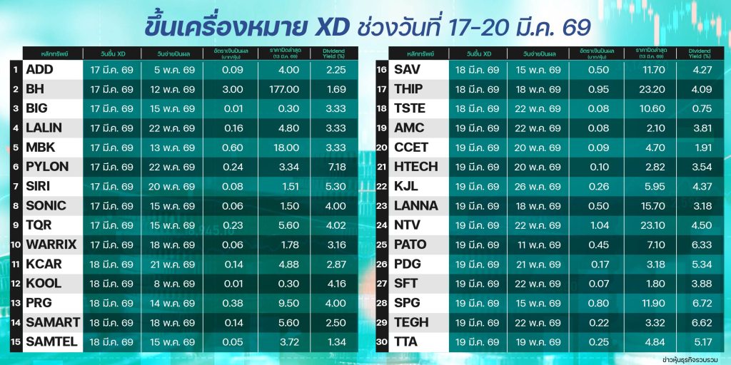 ทั้งนี้หุ้นที่จะขึ้น XD ในวันที่ 17 มี.ค.69 ได้แก่ ADD, BH, BIG, LALIN, MBK, PYLON, SIRI, SONIC, TQR, WARRIX