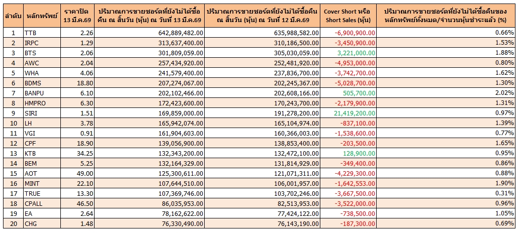 ข้อมูลสิ้นสุด 13 มี.ค.69 พบ TTB มีปริมาณชอร์ตคงค้างเหลือมากสุด 642 ล้านหุ้น คิดเป็น 0.66% และถูก Short Sales สูงสุด 6 ล้านหุ้น ส่วน SIRI ถูก Cover short สูงสุด 21 ล้านหุ้น