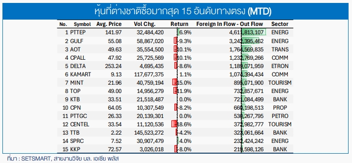 แม้ภาพรวมจะเป็นการเทขายตลาดหุ้นไทย แต่หากเจาะลึกลงไปในรายตัว จะพบว่านักลงทุนต่างชาติมีการปรับพอร์ตโดยเลือกซื้อหุ้นขนาดใหญ่ที่มีปัจจัยบวกเฉพาะตัว หรือได้อานิสงส์จากเทรนด์โลก โดย 15 อันดับหุ้นที่ต่างชาติซื้อสะสมมากที่สุด (MTD) มีกลุ่มที่น่าสนใจดังนี้