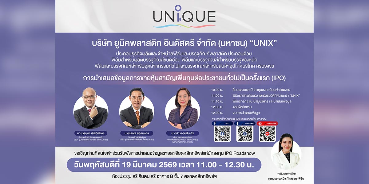 UNIX เตรียมจัดโรดโชว์เสนอขายหุ้น IPO ไม่เกิน 180 ล้านหุ้น ก่อนเข้าจดทะเบียนใน ตลาดหลักทรัพย์แห่งประเทศไทย เปิดแผนธุรกิจและศักยภาพการเติบโต ระหว่างวันที่ 19 มี.ค.69