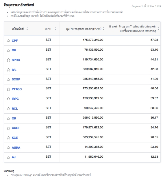 โดยบริษัท เจริญโภคภัณฑ์อาหาร จำกัด (มหาชน) หรือ CPF มีมูลค่าการซื้อขายผ่าน Program Trading จำนวน 475.27 ล้านบาท คิดเป็น 57.98% ของมูลค่าการซื้อขายแบบ Auto Matching ซึ่งอยู่ที่ 819.77 ล้านบาท