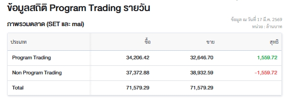 ผู้สื่อข่าวรายงานว่า วันนี้ (17 มี.ค.69) ตลาดหลักทรัพย์แห่งประเทศไทย (ตลท.) เปิดเผยข้อมูลซื้อขายรายวันผ่าน Program Trading หรือ “โปรแกรมโรบอทเทรดดิ้ง” พบว่ามีมูลค่าซื้อจำนวน 34,206.42 ล้านบาท และมูลค่าขายจำนวน 32,646.70 ล้านบาท เท่ากับซื้อสุทธิ 1,559.72 ล้านบาท