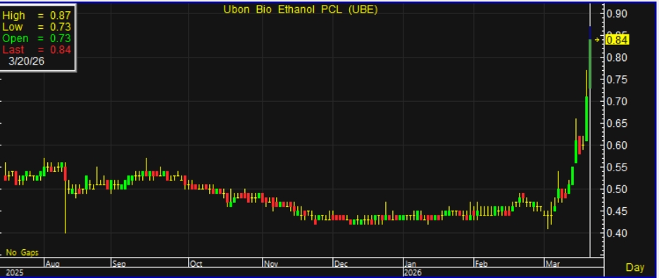 ผู้สื่อข่าวรายงานว่า วันนี้ (20 มี.ค.69)ราคาหุ้น บริษัท อุบล ไบโอ เอทานอล จำกัด (มหาชน)หรือ UBE ณ เวลา 10:32 น. อยู่ที่ระดับ 0.84 บาท บวก 0.13 บาท หรือ 18.31% สูงสุดที่ระดับ 0.87 บาท ต่ำสุดที่ระดับ 0.73 บาท ด้วยมูลค่าการซื้อขาย 100.38 ล้านบาท