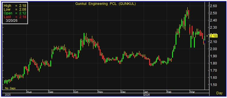 ผู้สื่อข่าวรายงานว่า วันนี้ (20 มี.ค.69) ราคาหุ้น บริษัท กันกุลเอ็นจิเนียริ่ง จำกัด (มหาชน) หรือ GUNKUL ณ เวลา 10:55 น. อยู่ที่ระดับ 2.18 บาท บวก 0.10 บาท หรือ 4.81% ราคาสูงสุด 2.18 บาท ราคาต่ำสุด 2.08 บาท ด้วยมูลค่าซื้อขาย 34.23 ล้านบาท